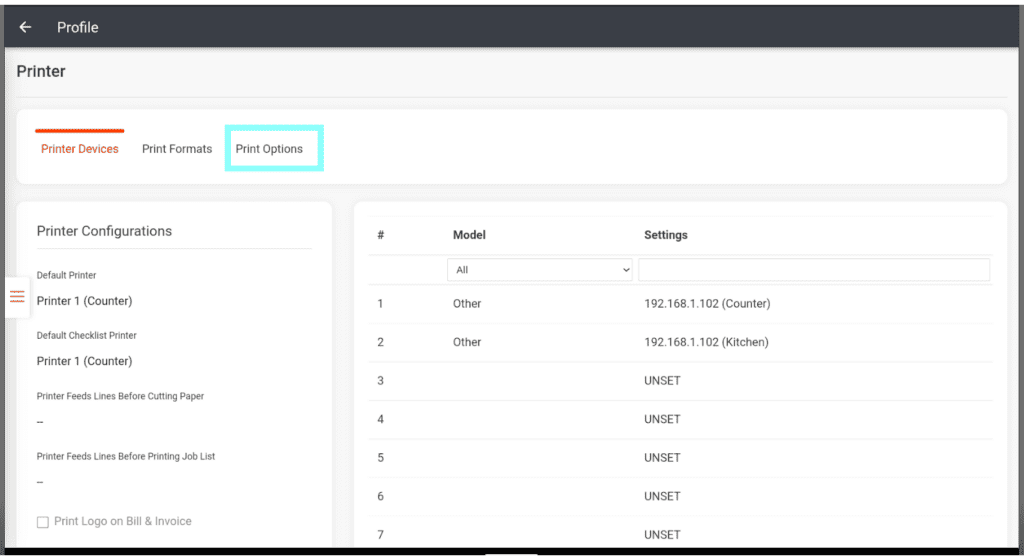 The bottom section of the printer options has the settings for receipt (invoice) printing.