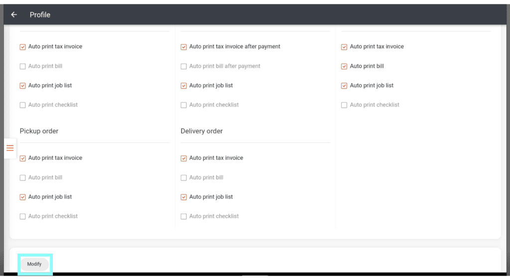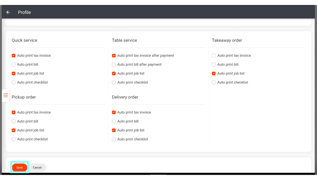 Note: Auto print job list is the setting for kitchen printing. If you turn this off, no kitchen dockets will print for those sale types.